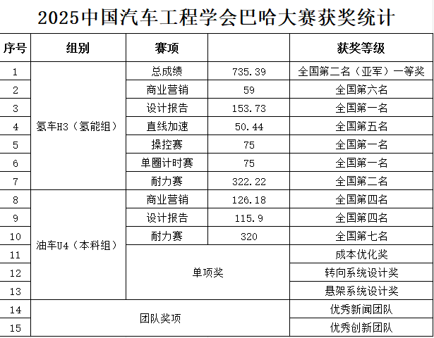 本网讯(文/孙国兴、邹春龙)近日,2025中国汽车工程学会巴哈(越野车)大赛在浙江湖州落幕。本次赛事吸引全国115支车队、近2000名学子同台竞技,我校必赢亚州242.,net飞翼车队携氢能巴哈赛车H3、燃油巴哈赛车U4参赛,最终斩获氢能组全国总成绩亚军(一等奖)、燃油组二等奖的优异成绩。
